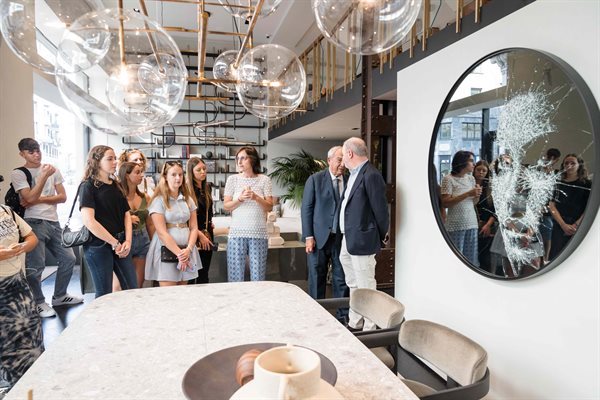 In the foreground Reflected Identities, a Limited Edition mirror created by the Swiss artist Simon Berger, capable with his hammer of canceling the boundaries between the work of art and the reflected image, in a suspended time made of lights and shadows, solids and voids.