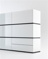 Floor standing modular system with plinth of elements in mink colour leather effect laminated wood. The units (fronts/top/sides) are covered by 6mm tempered painted glass as per samples, in the bright or satin version. The inside is made of leather effect laminated wood in mink colour. Bright anodised aluminium metal parts. Base and spacers in mink colour leather effect laminated wood. For room divider or double-sided compositions, a 6mm tempered painted glass back in the same finish of the unit is available. Modules can be placed side by side or superimposed. It is recommended to place no more than 3 modules.