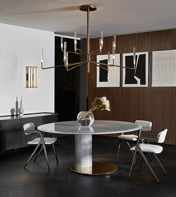 Hanging lamp with dimmable LED light. Handshaped glass cylinders. Hand burnished metal parts. The height can be customised from minimum of 115cm to a maximum of 450cm.