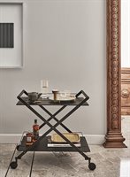 Trolley in 10mm transparent glass. Painted glass as per samples in the bright or satin version, on request. Bright or satin stainless steel metal parts. Handles in whitened oak, wengé stained, tobacco stained or black open pore lacquered oak. Available versions “total color” with lacquered structure opaque white, opaque grey and opaque black with satin painted glass tops in the same colour of the structure.