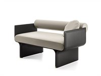 Small sofa with curved black open pore stained ash base and bright brass details. Also available opaque lacquered wooden version in the colours “Bianco Camargue”, “Sabbia del Nilo, "Rosa Jaipur”, “Rosso Persia”, “Bordeaux Etruria”, “Verde Provenza”, “Blu Pacifico”, “Grigio Londra” and “Nero Giza”. Padding in polyurethane foam covered by fabric or leather as per samples. Removable cover. Supplied with two diam. 38 cm downpadding cushion covered in the same finish of the armchair included. Additional stitching is required for elements with leather upholstery compared to elements with fabric upholstery.