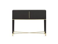 Writing desk with flap door in black open pore stained ash. Satin brass lacquered metal parts. 6mm bright liquorice painted glass top and inside back. Rhomboidal engraved pattern on the inside glass back. Inside part of flap door and small boxes covered by suede Grey 058. Supplied with inside LED light turned on by sensor as door is opened. Available while stock lasts.