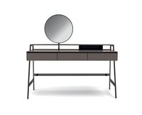 Vanity wooden desk covered by 6mm tempered glass and 10mm tempered shelf, both painted as per samples in the bright or satin version. Rotating (360°) double face mirror diam. 50cm. Magnifying mirrored insert, on request. Chestnut with “fabric” touch effect lacquered drawers. Burnished lacquered metal structure. Small boxes in metal covered by suede Sand 012. The mirror will be on the left side.