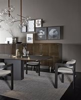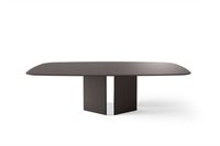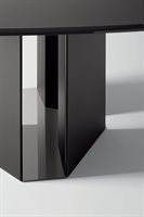 Tavolo con piano in cristallo 15mm retroverniciato nei colori del campionario, nella versione brillante o satinata. Piano con bisello 25mm. Base in legno rivestito in cristallo 6mm temperato retroverniciato nella stessa finitura del piano. Parti metalliche in acciaio inox lucido “supermirror”. Disponibile anche versione in cristallo verniciato bronzo patinato (escluso per piani cm 280/300).