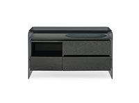 Comò con due cassetti grandi, un cassetto piccolo, vano a giorno e piano estraibile con inserto in velluto disponibile nei colori del campionario. Cassetti montati su guide a estrazione totale. Struttura e piano estraibile in frassino tinto nero a poro aperto oppure tinto grigio smoke a poro aperto. Piano superiore e fianchi in cristallo temperato “grigio Italia” oppure cristallo extralight 10mm. Parti metalliche in alluminio spazzolato anodizzato nero. Su richiesta vassoio porta oggetti da inserire all’interno dei cassetti, realizzato in legno grigio con fondo rivestito in velluto disponibile nei colori del campionario.