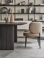 Tavolo con piano intarsiato in legno nella finitura “Ebano Capri”. Disponibile anche con piano in marmo lucido naturale Calacatta Vagli, Bianco Carrara Gioia o Verde Alpi. Basi ovalizzate rivestite in massello fresato di legno nella finitura “Ebano Capri” e dettagli in metallo cromato nero.